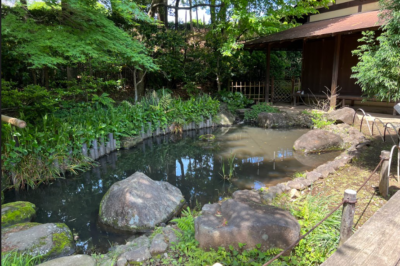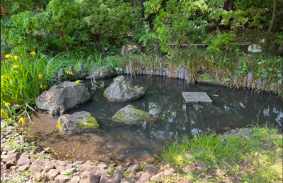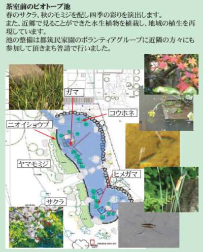 お茶室建設時の2009年に、既存のひょうたん型池の池底を荒木田で改修、水生植物を植えてビオトープ池にしています。1年を通じ水生植物を楽しめるように整備。池には黒メダカ、ザリガニが生息し、トンボも生息できる環境を目指して1年を通じて活動します。